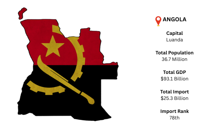 Angola is a Southern African coastal nation that borders Zambia, Namibia, and the Democratic Republic of the Congo. Angola's largest city and capital is Luanda. Rich in natural resources, the nation is heavily reliant on oil exports. In 2024, Angola's GDP is expected to reach USD 93.1 billion. Angola is the 78th-largest importer in the world, based on global import data. According to the latest data, China is Angola's biggest exporter. In 2024, as per Angola Import Data, Angola's total import value is projected to be USD 25.3 billion. The majority of the items that Angola imports from other countries are refined petroleum products.