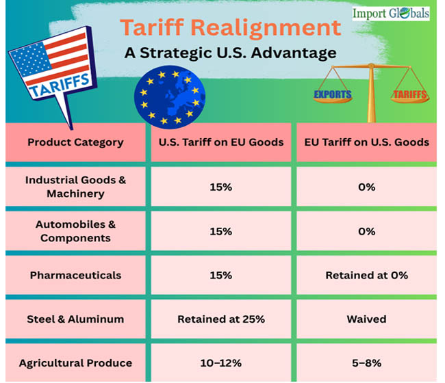 As per Europe Import Trade Analysis by Import Globals, EU manufacturers and trade organizations are concerned about this imbalance, claiming that the agreement limits access to European markets and unfairly benefits U.S. goods. Even if the agreement benefits both parties in several ways, the tariff restructuring is receiving a lot of attention. The new tariff structure looks like this: