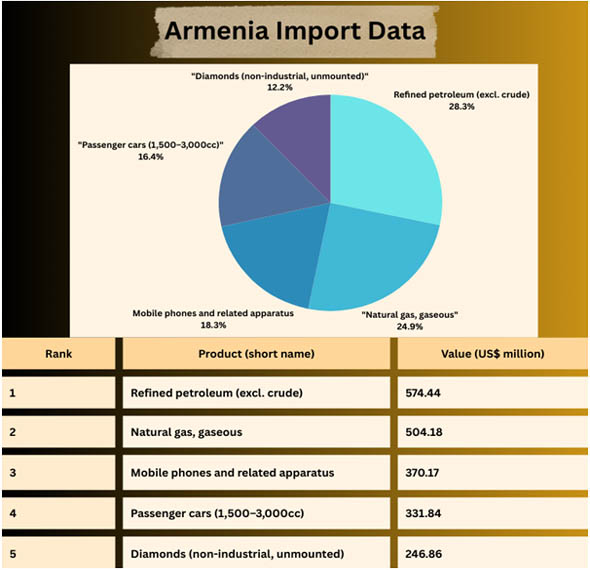 Energy is the main import, and it is a fundamental aspect of Armenia's economy. Transportation, electricity, and heating are supported by pipeline natural gas and refined petroleum (diesel, gasoline, and other distillates). The country's role as a redistribution hub for completed goods and strong consumer demand is reflected in the following lanes, which are passenger automobiles and cell phones. As a crucial component of Armenia's stone trade and processing before being sent elsewhere, based on Armenia Import Trade Analysis by Import Globals, diamonds on the import side fit in well with the export scenario above.