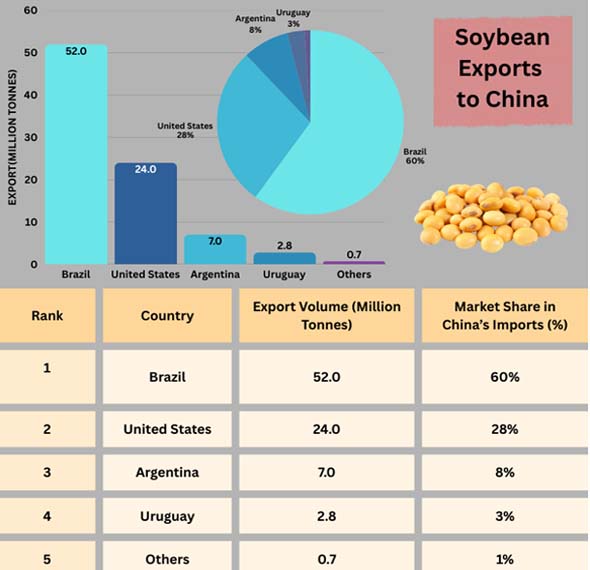 Uruguay is a consistent supplier of soybeans to China, even though it is much smaller than Argentina. Import Globals' Uruguay Import Data shows that the country grows between 2.5 and 3 million tons of soybeans each year, with China being the main buyer. In 2024, Uruguay sent 2.8 million tons of soybeans to China, which was over 70% of all its exports. Uruguay's agricultural industry has grown because of stable politics, strong business ties, and the country's ability to market itself as a reliable provider. People think of Uruguay as a low-risk trade partner, so China's shift toward it means both more demand and a plan to diversify.