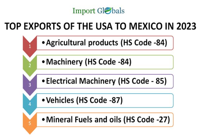 • Agricultural products (HS Code -84) – The United States of America exports the majority of its agricultural goods to Mexico to reduce tariffs and promote easier logistics. The high demands of agricultural products like corn, soybeans, and dairy are some of the key factors leading the export worth a value of 20 billion US dollars in 2023.