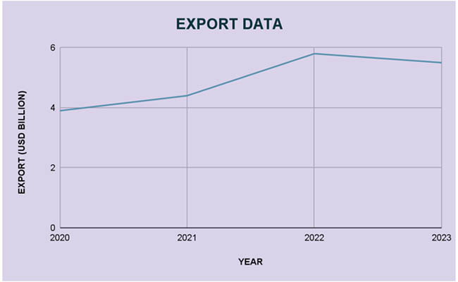The global economy and the dynamics of the commodity market have had a significant impact on Namibia's export performance over the last five years. Exports totaling about USD 3.9 billion were recorded in 2020, indicating the effect of the worldwide epidemic on trade. As per Namibia Import Trade Statistics by Import Globals, with exports rising to USD 4.4 billion in 2021, a 14.2% yearly growth, the next year saw a turnaround. This upward trend continued into 2022, with exports reaching USD 5.8 billion, representing a significant 31.9% increase from the previous year. However, due to some variables, including changes in the worldwide market and currency fluctuations, exports somewhat decreased to USD 5.5 billion in 2023, a 5.8% fall.