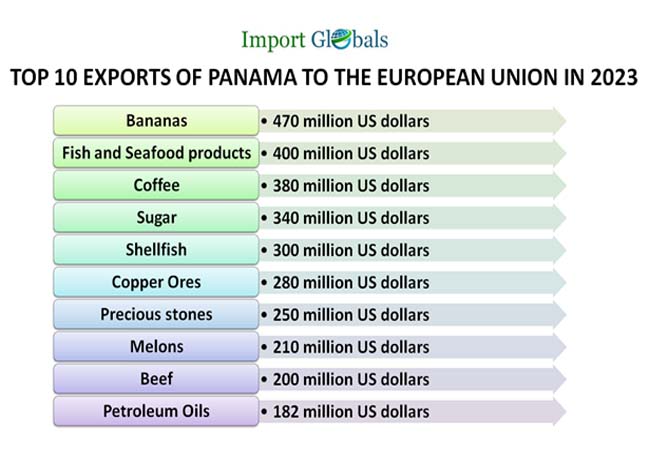 • Bananas – Valuation of Bananas exports from Panama to the European Union in 2023 – 470 million US dollars.