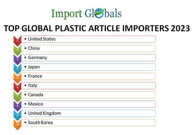• China – According to China Import Data, the import trade value of plastic articles in 2023 is 40 billion US dollars.