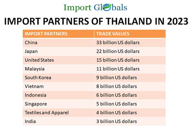 Geographically it is spread over an area of 513,210 square kilometers and is the 50th largest country across the globe in terms of land area. The country is an ideal hub for importers and exporters across the world due to its strategic geographic location. The globally emerging import trade rates of the nation have led to an import trade value of 260 billion US dollars in 2023 recording a significant increase from the previous year’s value of 200 billion US dollars and 170 billion US dollars in 2022 and 2021. The import traders facilitating the global import business of Thailand are (China – 33 billion US dollars), (Japan – 22 billion US dollars), (the United States – 15 billion US dollars), (Malaysia – 11 billion US dollars), (South Korea – 9 billion US dollars).