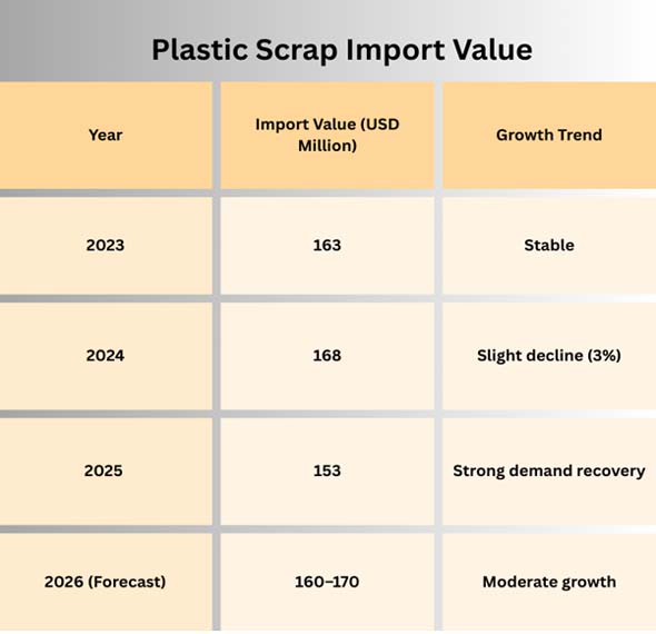 As per Malaysia Import Custom Data by Import Globals, forecast data shows that the growth rate will be consistent at roughly 4–5% per year until 2026. This is because demand from businesses is steady and the ability to recycle is expanding. Plastic scrap is only a small part of all imports (around 0.06% of all trade), but it is vital because it serves both industrial and environmental goals.