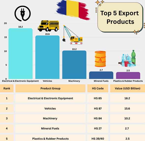 Exports of machinery and industrial equipment are valued around 10.2 billion, which is a bit more than 10% of total exports. As per Romania Export Data by Import Globals, these include parts for machines, industrial equipment, and parts shipped to the building and manufacturing sectors in Europe. Romania has a good engineering foundation and a low-cost industrial environment, which helps it stay competitive in EU supply chains.