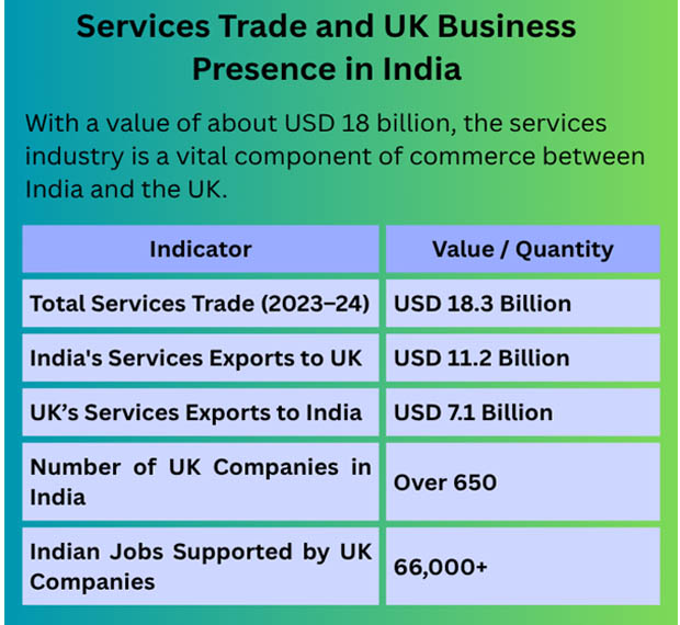 With a value of about USD 18 billion, the services industry is a vital component of commerce between India and the UK. India's top three service exports to the UK are business process outsourcing, financial services, and IT. In the meantime, as per the United Kingdom Import Trade Analysis by Import Globals, more than 650 UK businesses have operations in India, helping to transfer technology, create jobs, and improve skills. Together, these companies sustain almost 66,000 jobs, demonstrating the positive effects of bilateral investment on human capital.