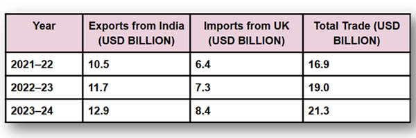 India-UK trade has been steadily increasing, rising from USD 16.9 billion in FY2021–2022 to USD 21.3 billion in FY2023–2024. Bilateral trade between India and the UK has steadily increased over the last three fiscal years. As per India Export Data by Import Globals, between FY2021–22 and FY2023–24, the value of traded products and services increased from USD 16.9 billion to USD 21.3 billion, indicating both volume growth and diversification. The trade connection is getting stronger, as seen by the 13.5% year-over-year increase in 2023–2024. This development is expected to continue when the treaty is finalized.