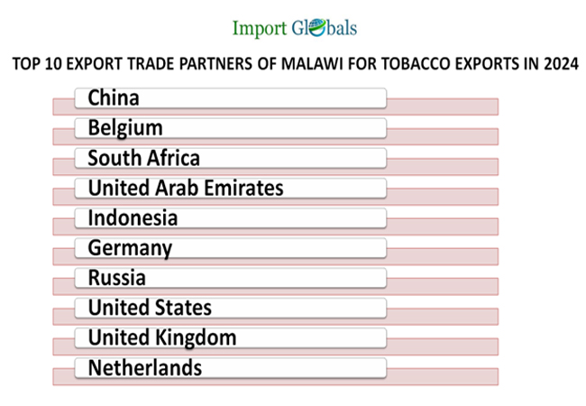 • China – According to the China Import Data, the valuation of the tobacco exports from Malawi in 2024 – 600 million US dollars.