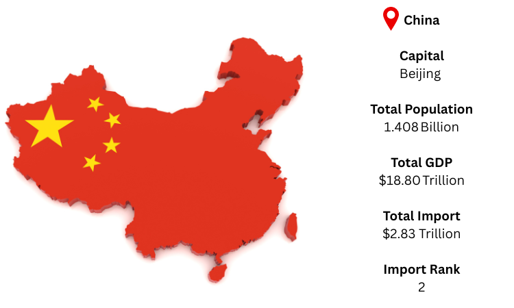 China is the most populous and second-largest economy in the world, and it is located in East Asia. Beijing serves as its capital. China is one of the world's biggest importers thanks to its extensive industrial base, export-driven manufacturing sectors, and expanding middle class. Based on China import data, China was the world's second-largest importer in 2024, with imports totaling USD 2.83 trillion.