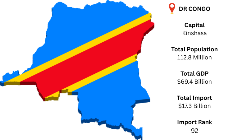 Nine nations, including Angola, Zambia, Uganda, Rwanda, and the Central African Republic, encircle the second-largest nation in Africa, the Democratic Republic of the Congo (DR Congo). One of the biggest French-speaking cities in the world, Kinshasa, serves as the capital. As per DR Congo import data, the GDP of the nation is expected to reach around USD 69.4 billion by 2024. DR Congo is the world's 92nd-largest importer, based on international trade statistics. According to the most recent data available, the People's Republic of China is the largest exporter to the Democratic Republic of the Congo. It is anticipated that DR Congo would import commodities valued at over USD 17.3 billion in 2024, with refined petroleum being the most frequently purchased commodity.