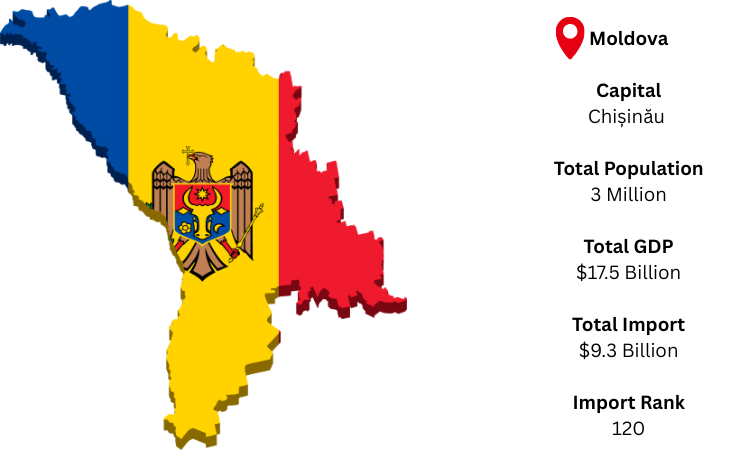 Moldova is a landlocked nation in Eastern Europe that shares borders with Ukraine and Romania. Chișinău serves as its capital. The GDP of Moldova was approximately USD 17.5 billion in 2024, based on Moldova shipments data. Moldova's imports totaled USD 9.3 billion, placing it 120th in the world according to Moldova import data. Mineral fuels and oils were the most popular imports, and Romania was its top import partner.