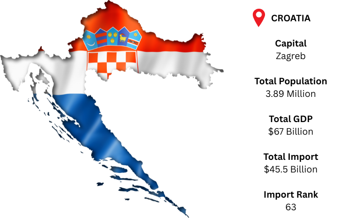 According to Croatia customs data, strong import flows of energy, machinery, automobiles, and pharmaceuticals are made possible by Croatia's ports, infrastructure, and EU membership.