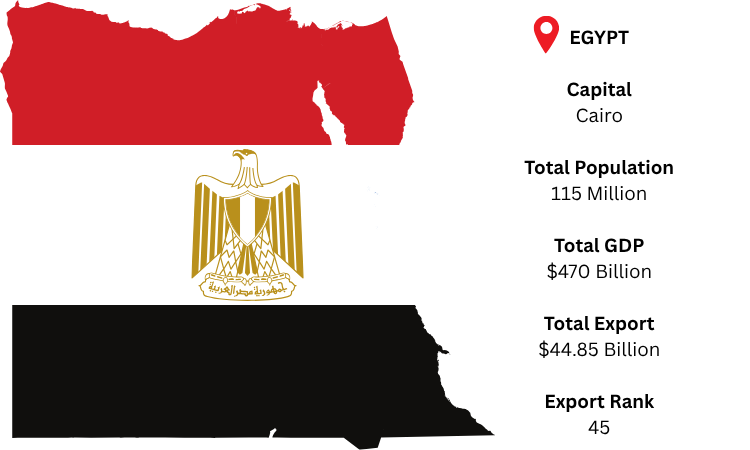 Energy, minerals, and industrial commodities are the main export drivers for Egypt, a significant export center in North Africa. The capital, Cairo, directs its economic policy. As per Egypt export data, with a population of around 115 million and a GDP of USD 470 billion, Egypt's overall exports in 2024 were USD 44.85 billion, mostly driven by electronics, precious metals, and oil and gas, despite pressures from the trade deficit.