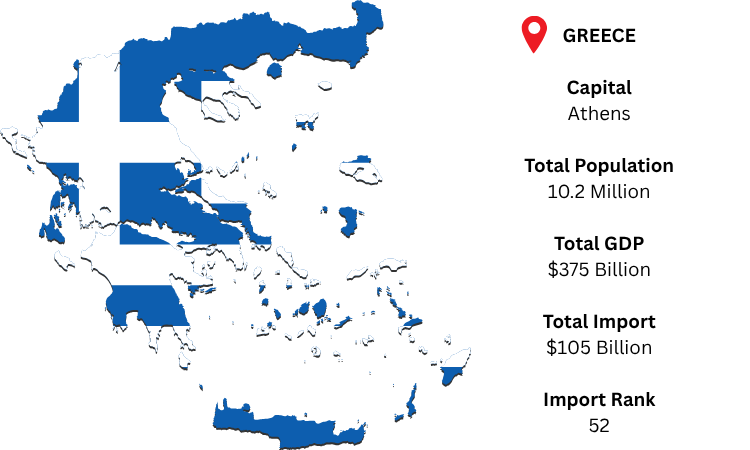 Greece, which is situated at the meeting point of Europe and the Eastern Mediterranean, depends largely on imports to sustain its consumer goods, industrial, and energy industries. The capital, Athens, serves as the primary center for commerce and commercial activity. As per Greece import data, Greece, which has a population of over 10.2 million and a GDP of nearly USD 375 billion, is expected to import USD 105 billion in total in 2024, underscoring its significance as a gateway to Southeast Europe.