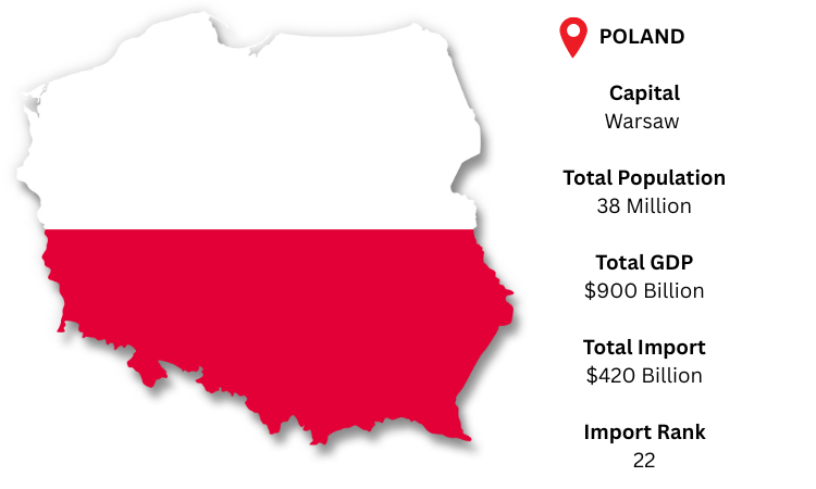 Poland is one of Central Europe’s largest and fastest-growing economies, driven by robust industrial production and an expanding consumer base. Its import portfolio is diversified, covering machinery, electronics, automotive parts, and energy resources. Warsaw is the capital, and Gdańsk and Gdynia are major ports handling high-volume trade flows. As per Poland import data, with a population of about 38 million and a GDP of around USD 900 billion, Poland’s total imports are projected at about USD 420 billion, reflecting its role as a key EU trade hub.