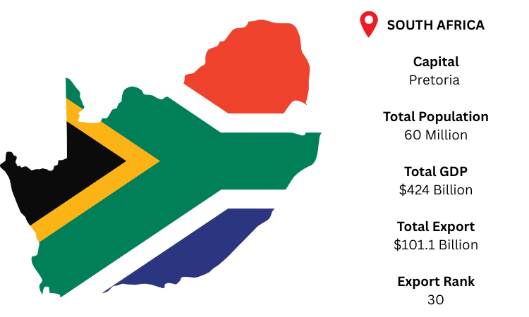 South Africa stands as Africa’s foremost exporter of minerals, metals, and vehicles, while diversifying into machinery, fruits, and beverages. Pretoria is the administrative capital (with Johannesburg serving as the primary economic hub). As per South Africa export data, with a population of about 60 million and a GDP of approximately USD 424 billion, South Africa’s total exports reached USD 110.1 billion, marking a USD 8.87 billion trade surplus.
