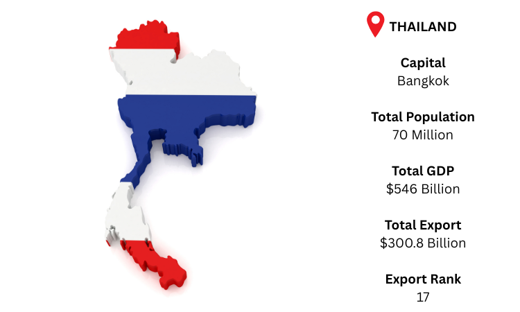 Thailand, which is well-known for its electronics, equipment, automobiles, and agricultural products, is a major manufacturing and exporting powerhouse in Southeast Asia. The capital, as per Thailand export data, Bangkok, is home to almost 70 million people and has a GDP of about USD 546 billion. With total exports of USD 300.8 billion and imports of USD 307.6 billion in 2024, there was a USD 6.8 billion trade imbalance.