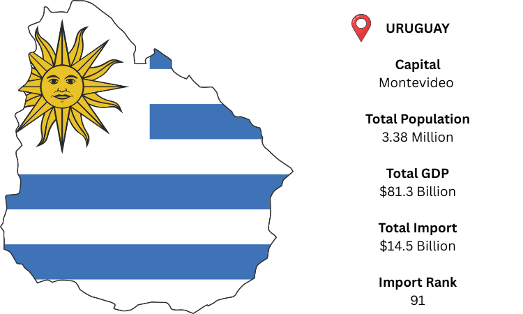 The Oriental Republic of Uruguay in South America is a tiny vibrant country both in terms of trade and culture. The nation holds a population of 5 million and occupies a land area of 176,215 square kilometers. Although the country has a comparatively small land surface due to its higher fertility rate it is growing its economy in a rapid manner mainly based on agricultural export trades like beef, soybeans, rice, and dairy products and import trades of industrial machinery. The country shares its vast land area with Brazil and Argentina in the north and west and is bordered by the Atlantic Ocean on the eastern coast.